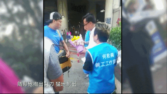 2019年11月6日,何君堯在街頭與市民見面。一名男子先是送上鮮花,靠近攀談,又提出要從包中拿手機出來拍合影。隨即,他掏出尖刀,猛地刺出。