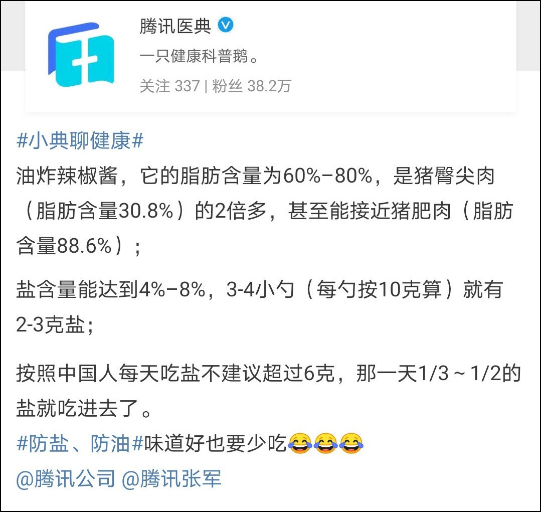 7月1日晚,騰訊旗下的@騰訊醫典 發微博稱,油炸辣椒醬的脂肪含量高,鹽含量也高,可以達到中國人健康飲食指南中給出的建議上限的1/3-1/2,因此“防鹽、防油,味道好也要少吃”。