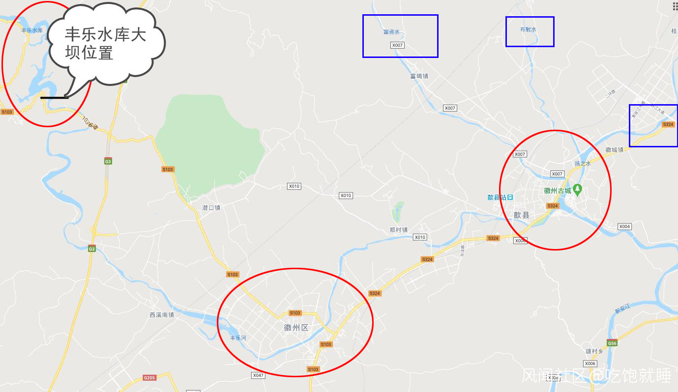解釋清楚泄洪時間的問題,再來看一下豐樂水庫、新安江水庫與歙縣的地理關係。