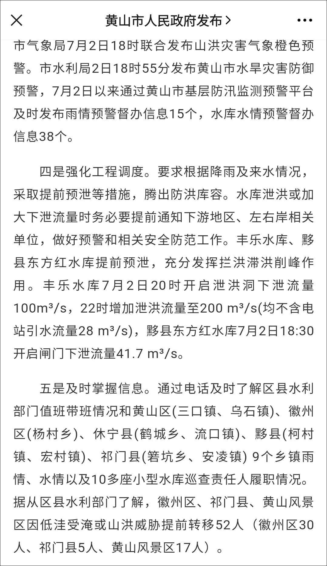 根據公眾號“黃山市人民政府發佈”7月3日消息,由於連日來黃山市普降暴雨、大暴雨,黃山市水利局已經發布工作安排,其中要求提出“要求根據降雨及來水情況,採取提前預泄等措施,騰出防洪庫容。水庫泄洪或加大下泄流量時務必要提前通知下游地區、左右岸相關單位,做好預警和相關安全防範工作。”