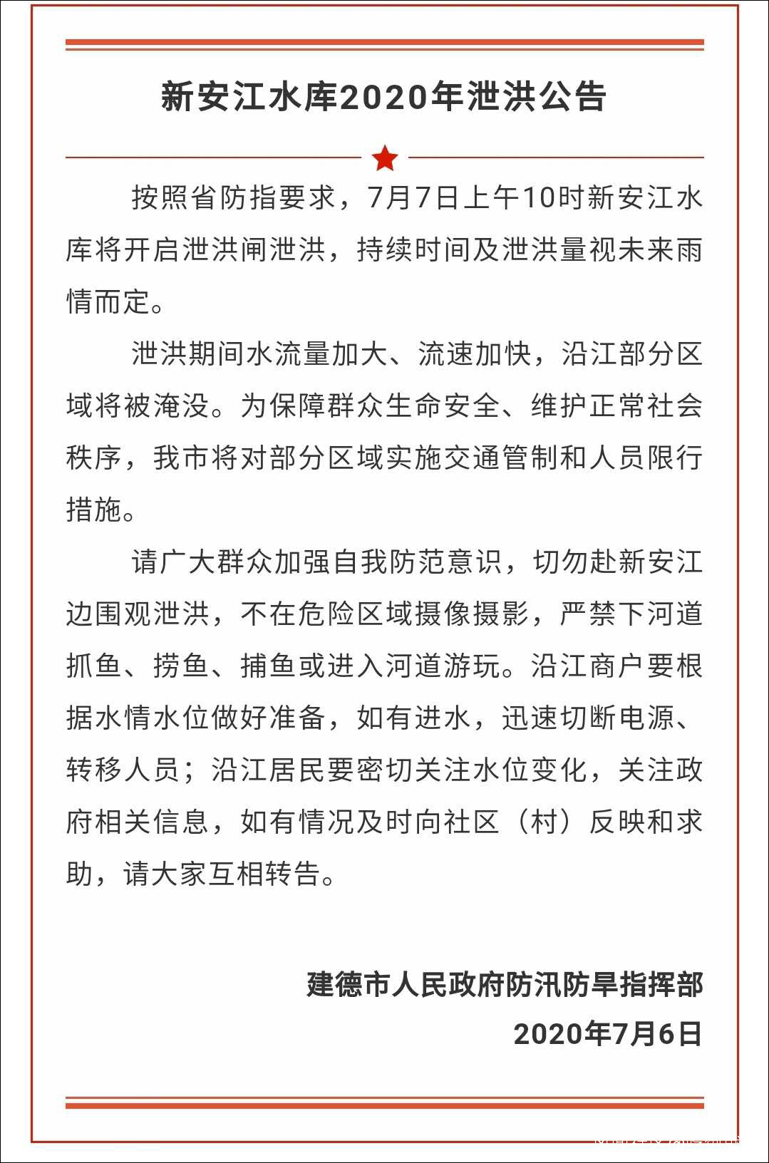 另外,據公眾號“建德發佈”,浙江省7月6日召開汛情通報會,宣佈7日10時對新安江水庫開啓3孔泄洪閘泄洪。當晚,包括建德市人民政府新聞辦公室“建德發佈”,建德市新聞傳媒中心“今日建德”在內的多個公眾號、微博發佈《新安江水庫2020年泄洪公告》,提醒廣大羣眾加強自我防範意識,沿江商户根據社會請誰為做好準備,並相互轉告。