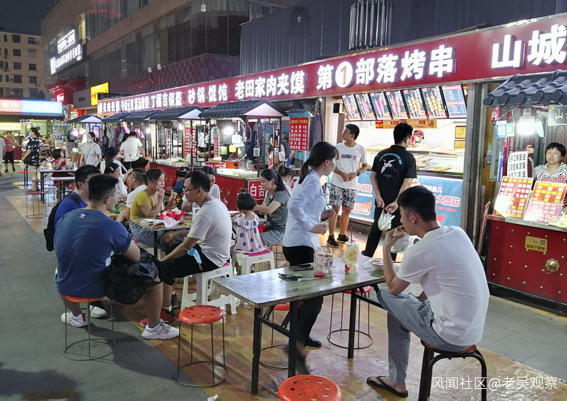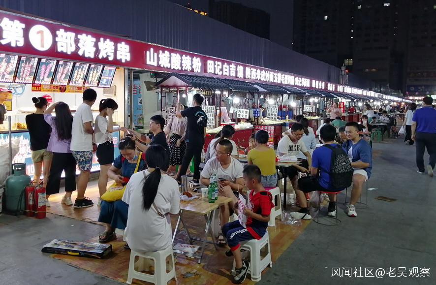 逛完二七商圈,來到大學南路夜市街,這裏雖然沒有市區華麗的燈光,但這裏熱鬧和繁華一點也不比市區差,近千米街道中間和兩邊擺滿攤位,筆者粗略數了下,各種風味小吃攤就有幾十個,三三兩兩圍坐在一起,享受着空曠的夜晚時光。