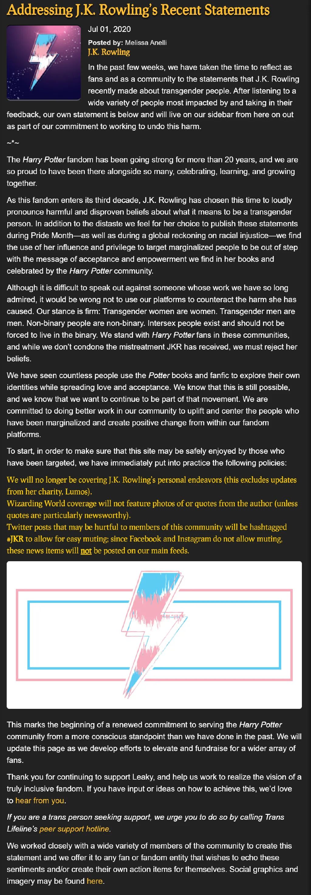 在系列事件之後,《哈利·波特》兩大粉絲網站MuggleNet和TheLeakyCauldron聯合發佈聲明,表示因作者JK羅琳對邊緣羣體的言論與《哈利·波特》書中以及粉絲羣體所提倡的包容性價值觀產生衝突,決定與其保持界限,不再發布與她個人事業除慈善外有關的內容,不再發布她的照片、引用她的表述,也不再發布任何指向作者網站的鏈接。