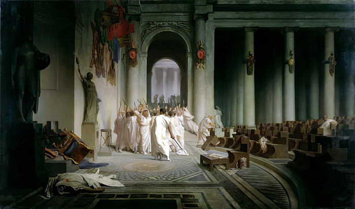《裘利烏斯·凱撒之死》,裘利烏斯·凱撒在打敗政敵之後,自命為獨裁者,後在羅馬元老院裏遇刺而死,這是謀殺者們在歡呼