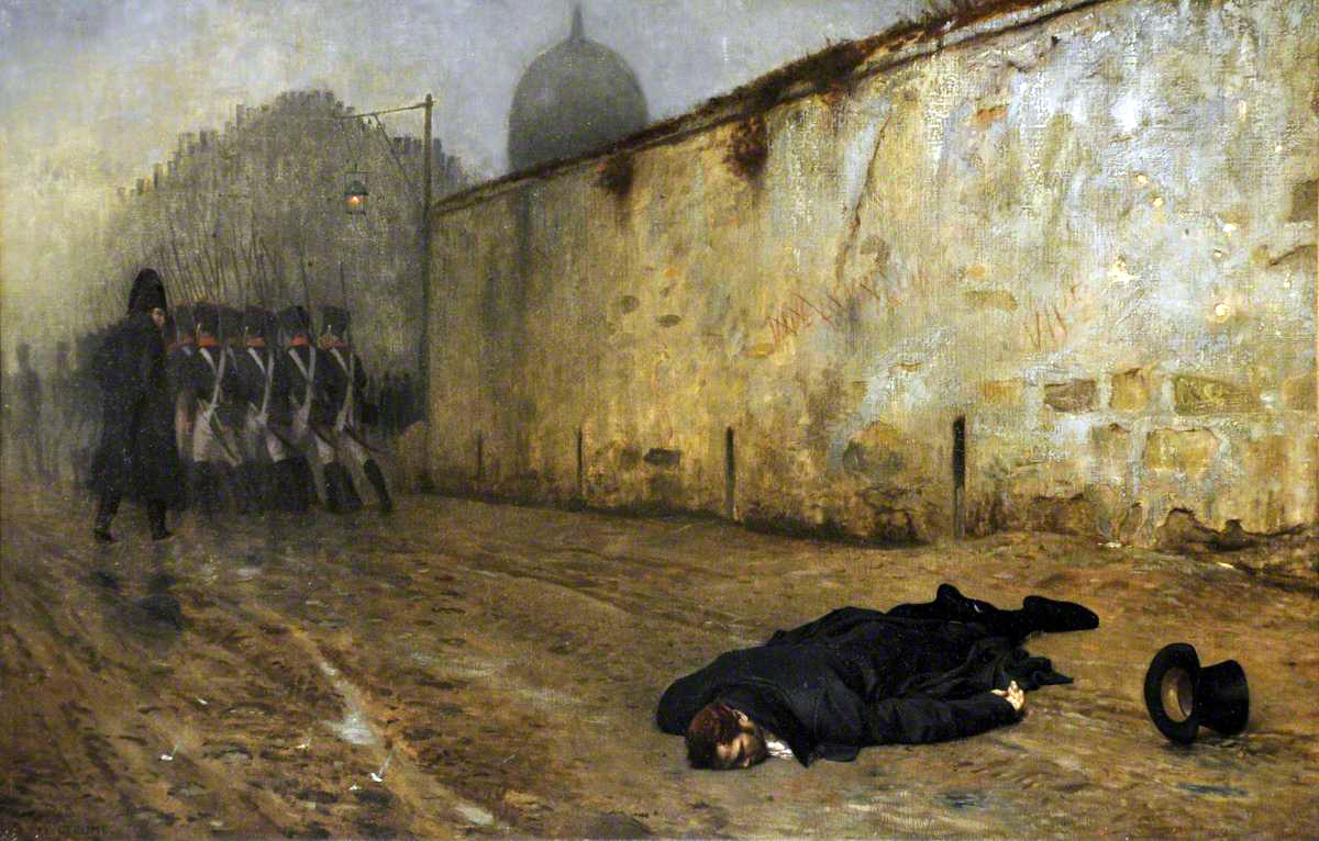 《處決內伊元帥》,內伊是拿破崙最得力的干將。拿破崙被髮配聖赫勒拿島後,內伊也受到軍法審判,在行刑隊面前,內伊拒絕蒙上眼睛,並要求由自己發佈開槍的命令:“士兵們,我命令開槍的時候,瞄準一點,要直接命中我的心臟。現在等我的命令。這是我最後的命令。我抗議對我的死刑。我為法國打了一百多場戰鬥,從未向法國打仗。……士兵們,開槍!”