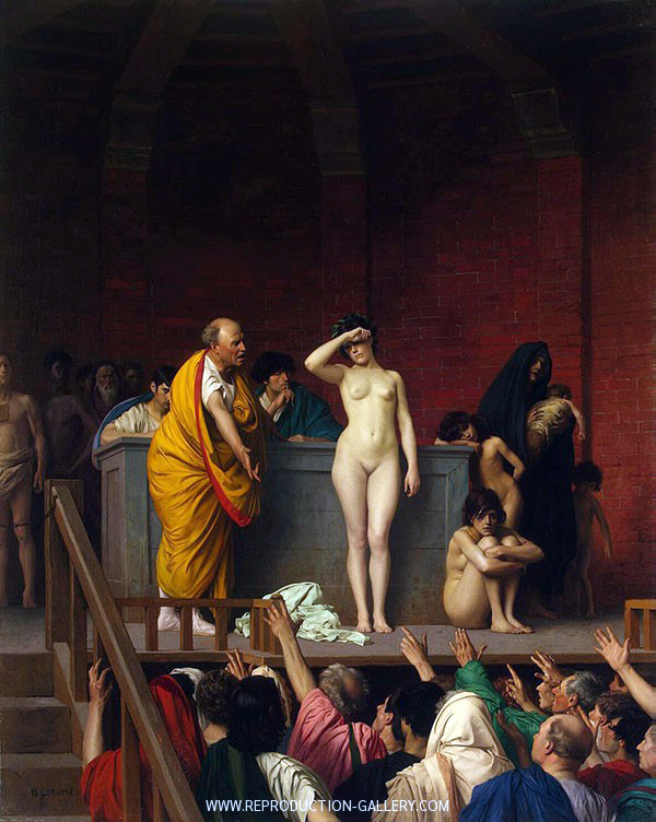 《女奴市場》,Jean Leon Gerome畫了一系列女奴市場,刻畫了被販賣女奴的屈辱和無奈,也迎合了流行的男權情節