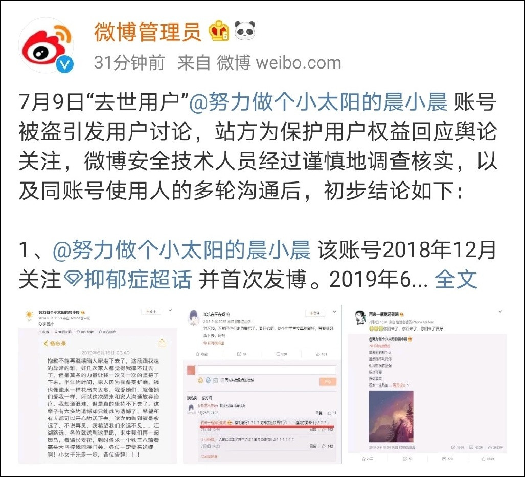 7月9日“去世用户”@努力做個小太陽的晨小晨 賬號被盜引發用户討論,站方為保護用户權益回應輿論關注,微博安全技術人員經過謹慎地調查核實,以及同賬號使用人的多輪溝通後,初步結論如下: