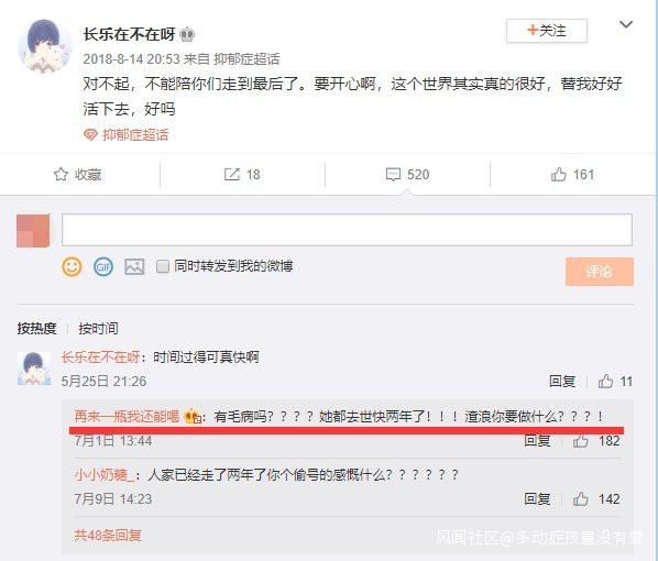 2、在排查過程中,微博注意到,該設備上還登錄有兩個賬號:@長樂在不在呀 和 @再來一瓶我還能喝。其中,@長樂在不在呀 亦曾經活躍在#抑鬱症#超話,2018年8月14日發佈疑似離世的帖文(見配圖2)後,也轉為只看不發言。