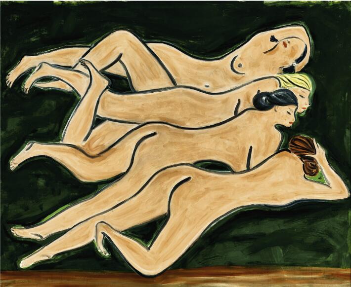 此次競拍的《綠色背景四裸女》,長122釐米,寬100釐米,為油彩纖維板,畫中俯卧四位裸女,姿態、髮色、面容都不同,似乎正佯倘於夏日的青翠草地,享受一場温暖愜意的日光浴。