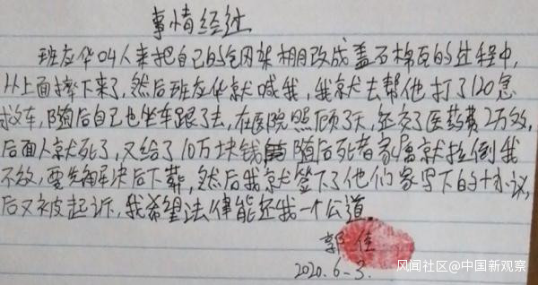 “班應華叫人來把自己的鋼架棚改成蓋石棉瓦磚混棚,鋼架棚拆除後磚混棚已完成立柱時,務工者羅啓龍站在木質橫樑上不慎墜落……隨後死者家屬纏住我不放,要先談妥賠償,後下葬,然後我就簽下了他們家已經寫好的協議,後又被起訴,我希望法律能還我一個公道。”郭佳對記者説。