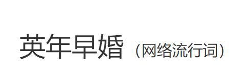 “英年早婚”,其含義為英俊的少年早早的結了婚,給了無數迷戀他的少女以暴擊,因此女生們常常用該詞來表示自己的“遺憾惋惜”,多為飯圈常用語。