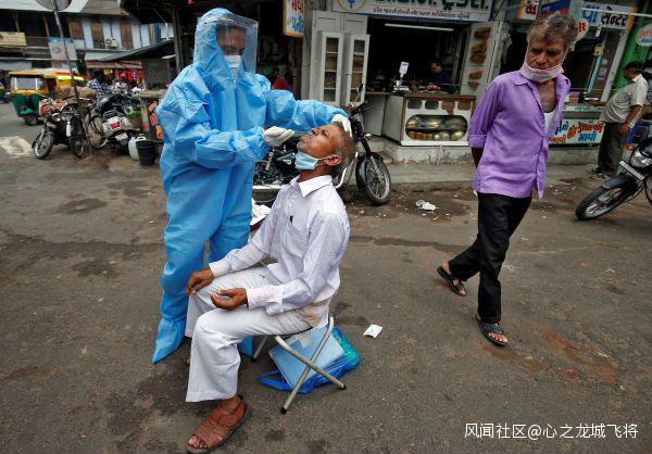 7月7日,醫護人員在印度艾哈邁達巴德為一名男子做新冠病毒檢測採樣。新華/路透