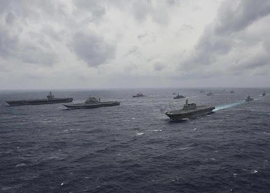 2017年7月10日,美日印三國的“馬拉巴爾”海上聯合軍演正式啓動。演習共出動了15艘軍艦、2艘潛艇和幾十架軍機,並且三國分別派出了尼米茲號、維克拉瑪蒂亞號和出雲號三艘航母。而這個軍演的日子,離6月18日中印洞朗對峙過去不到一個月的時間。
