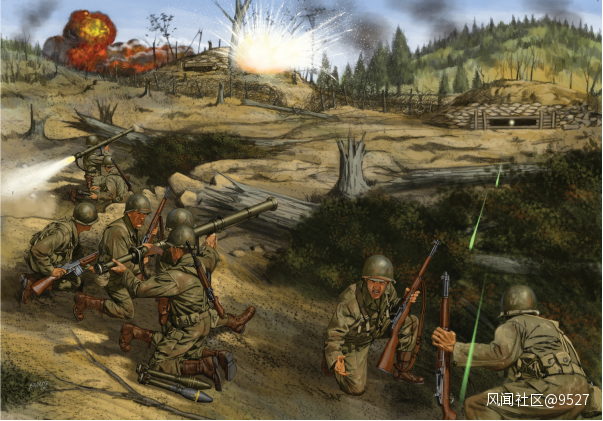 1945年,德國。步兵們得到了新的2.36英寸M9火箭筒,以取代M1A1。這種經過大幅改進的型號提供了一個兩節式的發射管,更好的瞄準器,50碼的有效射程,以及更可靠和更致命的高爆破甲火箭彈。即使是提供更大穿透力的炮彈,最有效的命中還是在坦克的側面和後部。隨着盟軍越來越多地使用空心裝藥,特別是便攜式火箭筒、槍榴彈和手雷,1943年3月,德國人開始在許多坦克和突擊炮上加裝裙板(Schürzen)。這其實不是裝甲板,而是0.2in厚的金屬板。更厚的0.31英寸的裙板被加在炮塔上。軍人稱這種裙板為 “火箭筒褲”。1944年9月,鐵絲網裙板(Drahtgeflecht Schürzen)取代了同樣外形的金屬板。它更輕,成本更低,而且同樣有效。無論哪種裙板都會使空心裝藥彈在離車體/炮塔很近的地方引爆,並在一定程度上消散了穿透性破甲。在這個戰例中,攻擊一輛PzKpfw IV Ausf.H(又名Mk IV)的兩人火箭筒組的裝填手攜帶了兩個M6火箭袋,每個火箭袋可裝三發火箭彈。