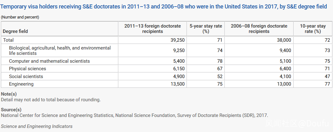 如果按學科劃分,在USA拿到博士學位的所有外國人(下表未按國別細分)中,社會科學專業的畢業生大約只有一半會在博士畢業後5年仍然留在USA。