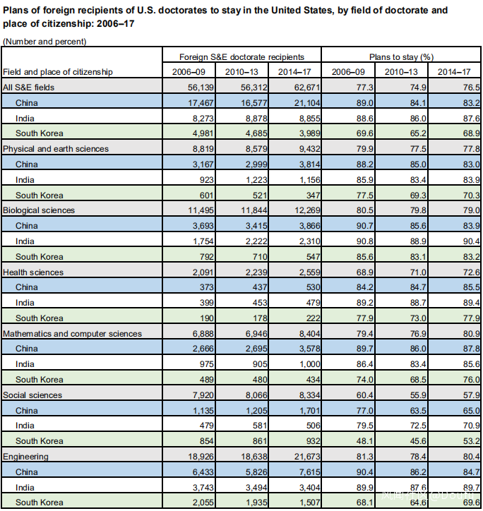 從2019年USA政府對於海外生源的博士畢業後留在USA工作的官方調查報告——“Science and Engineering Labor Force:Immigration and the S&E Workforce”(統計數據截至2017年,以下所有原始數據和圖表均來自該報告)來看,中國大陸和香港地區各高校生源在2011-2013年拿到博士學位後五年仍留在USA的比例達到83%,而2006-2008年拿到博士學位後十年都留在USA的比例高達90%。