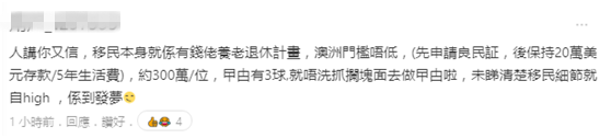 也有網友表示,人講你又信,移民本身就是有錢人養老退休計劃,澳洲門檻不低,約300萬/位,曱甴有3球,就不洗抓攔塊面去做曱甴啦,未看清楚移民細節就自high,繫到發夢。