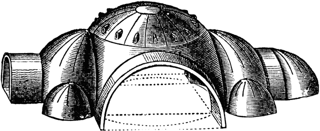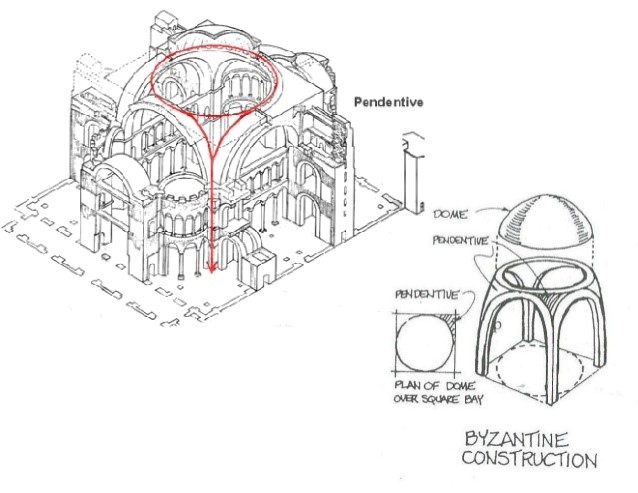 索菲亞大教堂是拜占庭拱頂(右)的深度發展,結構非常複雜,可以看作半球坐落在方凳上,但兩者之間還是有三角弧面過渡