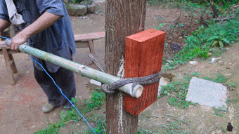 接着,把木塊綁到樹上按照尺寸開鋸: