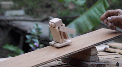 在視頻裏,阿木爺爺將一塊普通木頭,變成了可以任意摺疊甚至變形的凳子,變成了能夠自己蹦躂的小袋鼠,變成了會打架的小武生,變成可以騎來騎去的小木馬……