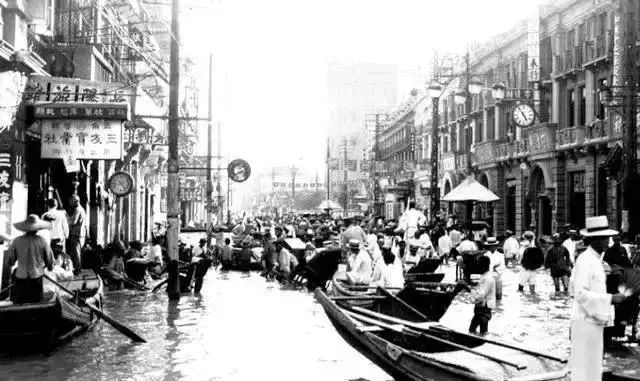 當時的《國聞週報》刊登過這樣一幅照片:在漢口市繁華的中山路上,濁浪滾滾,漫無邊際。高樓、電杆泡在水裏,各種船隻在通衢大道上往來行馳。
