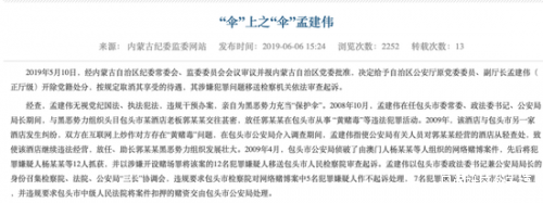 2019年6月,內蒙古紀委監委曾刊發《“傘”上之“傘”孟建偉》的文章。文中提到,自治區公安廳原副廳長孟建偉無視黨紀國法、執法犯法,違規干預辦案,親自為黑惡勢力充當“保護傘”。
