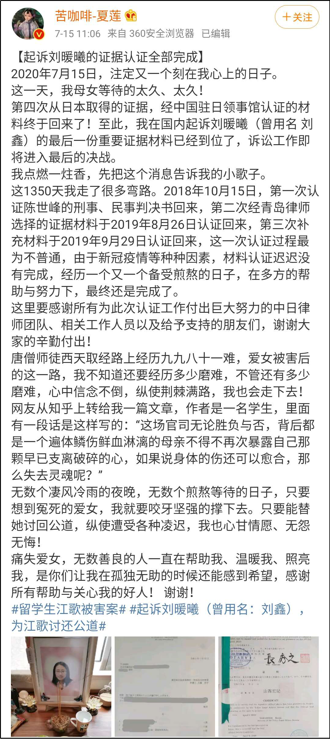 7月15日中午,“江歌案”當事人江歌的母親江秋蓮發佈微博稱,起訴劉暖曦(曾用名 劉鑫)的證據認證全部完成,並表示“訴訟工作即將進入最後的決戰”。目前,該案開庭審理時間暫未確定。