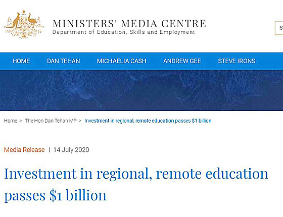 聯邦教育部長特翰(Dan Tehan)表示,聯邦政府的重點是確保更多的邊遠地區、農村和原住民學生能夠接受高等教育。他説:“我們政府認為,每個澳人都應該有機會接受世界級的教育,我們在為準備好就業的畢業生的一攬子計劃中宣佈的針對澳洲邊遠地區和農村地區的新措施,為其高等教育上的投資增加了4億元。”