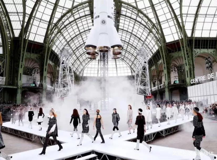人類的第一次登月,就激活了未來主義時尚浪潮,太空裝 Space Look大行其道。2017年,Chanel將秀場佈置成了火箭發射場景,模特行走在巨大的火箭裝置之下。
