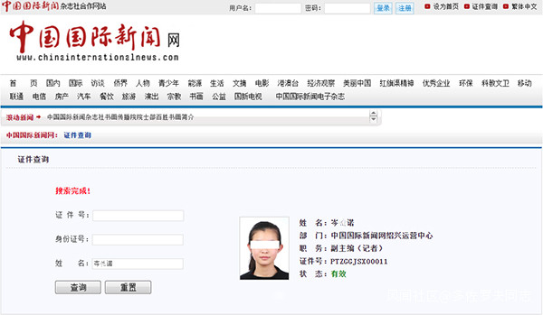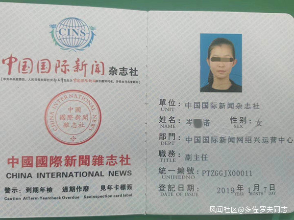 岑某諾的中國國際新聞雜誌社 工作證 岑剛燦朋友圈 圖