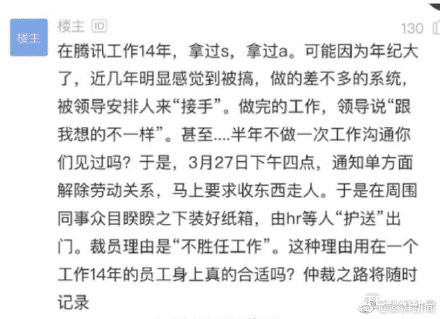 據紅星新聞14日報道,涉事前員工閆先生2012年7月入職騰訊,是遊戲平台部高級工程師。閆先生稱,2019年3月28日,被解職當天,騰訊公司單方面暴力裁員,讓很多保安逼迫其收拾東西離開,當場封掉工卡、內網賬號、公司郵箱等所有騰訊內部權限和資料。