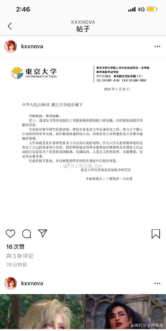 東京大學聲明一出,許可馨立即為梁豔萍站台
