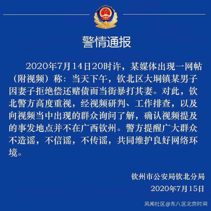 2020年7月14日20時許,某媒體出現一網帖(附視頻)稱:當天下午,欽北區大垌鎮某男子因妻子拒絕償還賭債而當街暴打其妻。對此,欽北警方高度重視,經視頻研判、工作排查,以及向視頻當中出現的羣眾詢問了解,確認視頻提及的事發地點並不在廣西欽州。