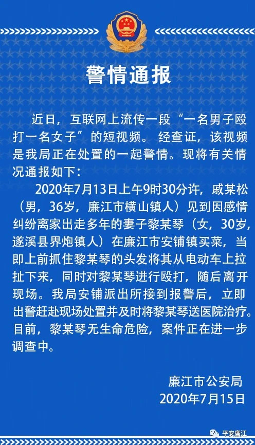 近日,網上流傳一段“男子毆打女子”的短視頻系當地公安機關正在處理的一起警情。經查,7月13日,男子戚某松見到因感情糾紛離家出走多年的妻子黎某琴在買菜,當即上前對其進行毆打,隨後離開現場。目前,女子無生命危險,案件正在進一步調查中。