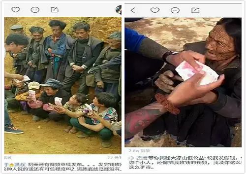 快手兩名主播安排涼山某村村民站成兩排,直播給村民發錢,獲取打賞無數。