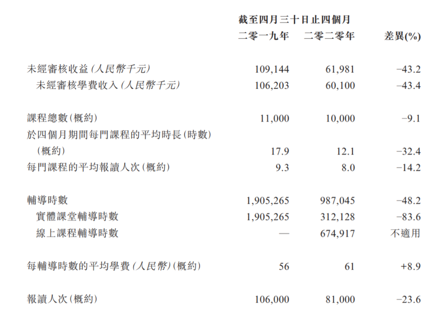 但重度依賴線下、依賴鄭州市場的模式,讓大山教育的抗風險能力很低。特別是在疫情之下,線下業務的停滯導致了業績的全方位倒退。招股書顯示,截至4月30日的前四個月,大山教育幾乎各項數字都出現不同程度的下滑。
