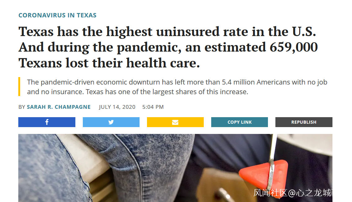 另外,《得克薩斯論壇報》發表文章稱,得克薩斯州是全美無保險人口比例最高的州,僅在此輪新冠肺炎疫情期間,就有65.9萬得州人失去醫療保險。截止到今年5月,得州預計有29%、約490萬65歲以下的成年人沒有醫療保險,這也是全美各州中最高的無保險率。