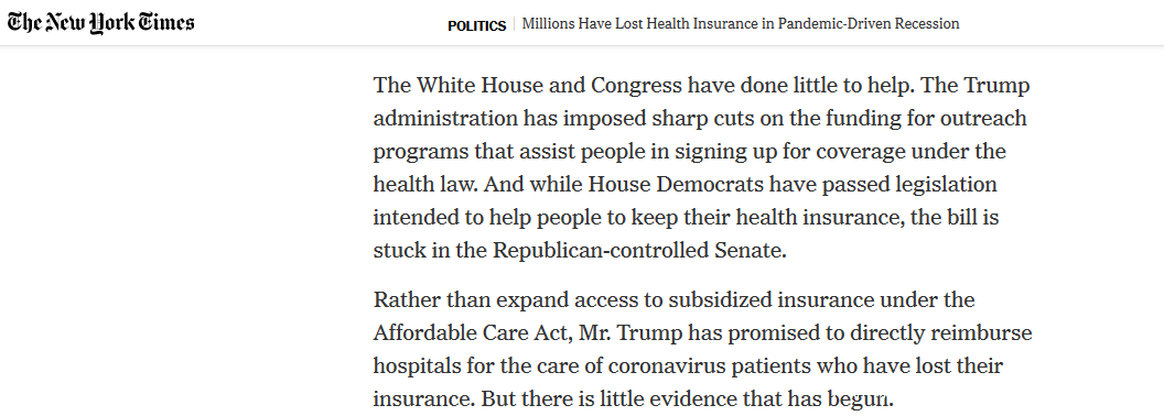 報道批評特朗普政府未對保護普通人的醫療報銷做出過任何有益舉措,特朗普政府不僅大幅削減用以支持登記申請醫療保險的民眾的醫療基金數額。對於此前民主黨通過在眾議院通過立法想要保護民眾繼續享有醫療保險,也最終未能在由共和黨人主導的國會參議院獲得通過。