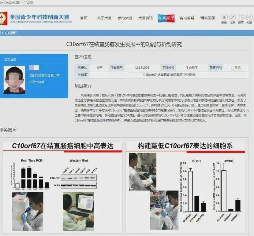 在去年全國青少年科技創新大賽,來自雲南昆明的六年級小學生陳靈石就以一篇《C10orf67在結直腸癌發生發展中的功能與機制研究》獲得三等獎。