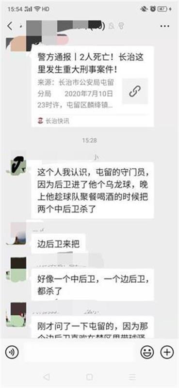當地警方公佈調查結果之前,一張長治市某業餘足球隊微信羣聊天截圖在網絡流傳,其中稱上述命案系“守門員殺害進烏龍球后衞”,引發網友、球友關注。記者14日從長治市公安局屯留分局證實,“守門員殺害進烏龍球后衞”為謠言。