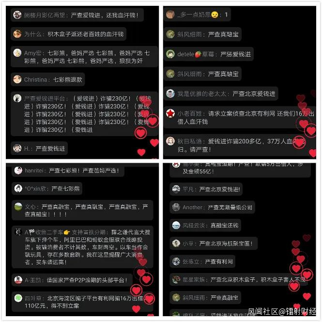 值得一提的是,真融寶、愛錢進、有利網、恆昌、點融網、七彩熊繪本、積木盒子成為本次3·15晚會的一道“靚麗的風景線”。在央視新媒體旗艦平台央視頻直播的留言中,有大量用户對上述平台進行實時投訴,留言近乎刷屏。