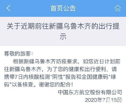 3昨天起多家航司和OTA通知,根據新疆烏魯木齊防疫要求,前往烏魯木齊需攜帶7日內核酸檢測“陰性”報告和全國健康碼“綠碼”以備核查。