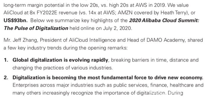 ——“截至目前,包括高盛、摩根士丹利在內,國外投行對阿里雲的估值模型附註中均表示,是按照IaaS和數據中心業務同類估值.”