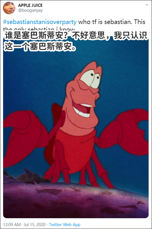 還有網友直接嘲諷,“塞巴斯蒂安我只認識這一個,您誰啊?”((《小美人魚》裏面的螃蟹叫塞巴斯蒂安))
