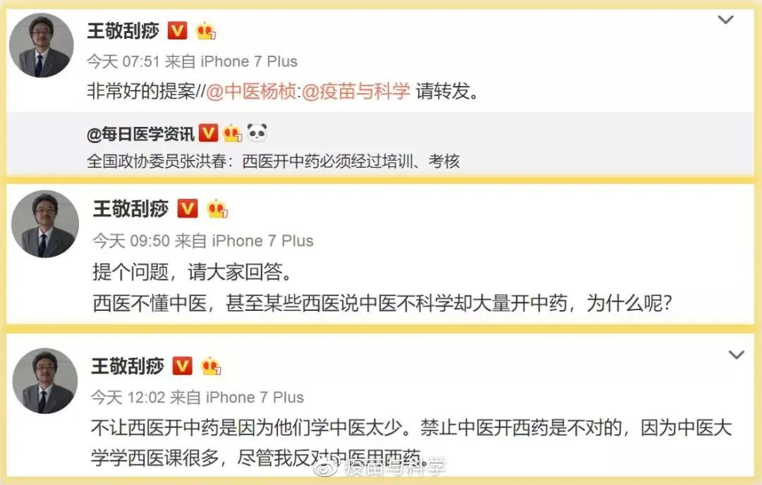 中國中醫科學院副主任醫師、中醫刮痧專家、有224萬微博粉絲的王敬醫生認為,不讓西醫開中藥是因為他們學中醫太少,反過來禁止中醫開西藥是不對的,因為中醫大學的西醫課很多,但他本人反對中醫用西藥。