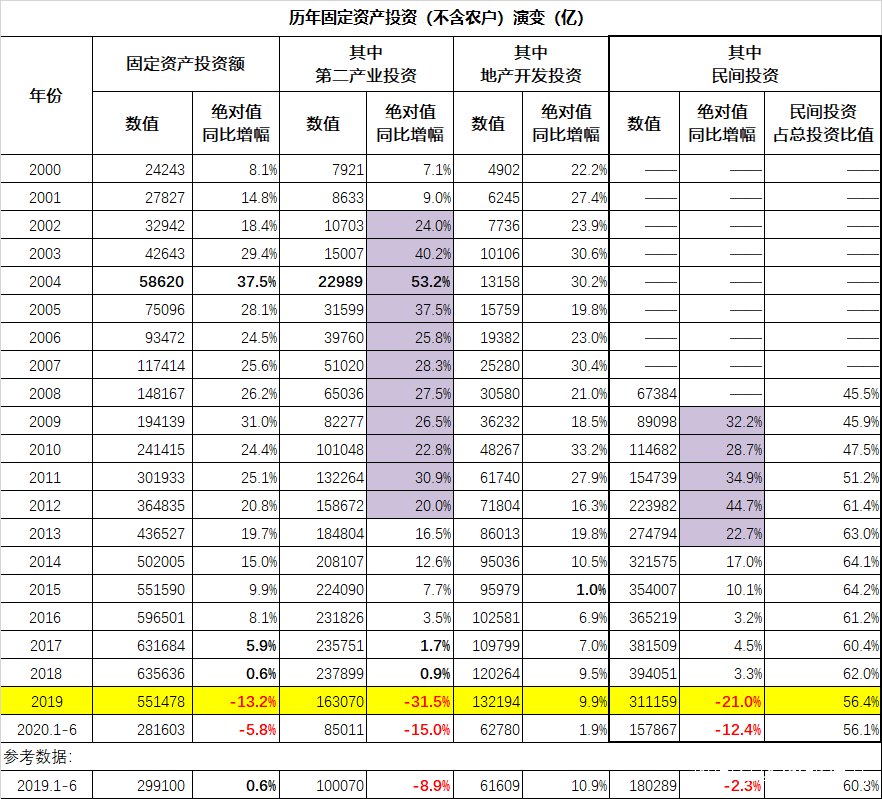 更麻煩的是,民間投資的熱情已經消失了,2013年後民間投資的增幅就劇烈下降,到2019年下降到負值,-21.0%,今年上半年為**-12.4%。民營企業家不願意投資了,要實現投資增長,只能指望國家財政,這意味着財政投資的壓力還要再翻倍。這種情況簡直就是無解。當然了,好玩的地方在於,房地產開發投資還是正值,不過增幅也只有1.9%**。這個數據,乃是開啓住房市場化改革以來的第二差值,僅比2015年的1.0%稍微好一點。