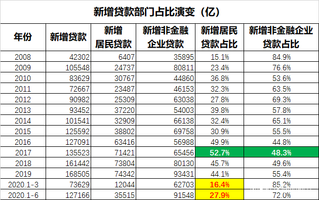此後商業銀行找到了新的借款人——購房者!老百姓借錢買房,成為了銀行資金的主要流向,這就是地產去庫存政策出台背後的經濟必然性。體現在數據上,就是新增居民貸款佔總貸款的比值,越來越高,2015年的佔比還只有30.9%,2016年就暴增到49.9%,2017年甚至達到了歷史峯值52.7%。2018年和2019年的地產市場其實已經喪失整體上的增長性, 不過居民貸款佔還是維持在45%左右。到了今年上半年,由於地產市場的繼續萎縮,居民貸款佔比下降到了27.9%,全年佔比能不能上升到40%,是一個巨大的疑問。