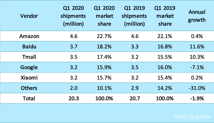 以Canalys發佈的2020年Q1智能音箱出貨量報告為例,小度、天貓精靈、小米的出貨量分別達到370萬台、350萬台和320萬台,在市場份額上並未拉開太大差距。不過細化到有屏智能音箱的維度上,小度的出貨量為250萬台,天貓精靈和小米的出貨量僅有70萬台和60萬台。