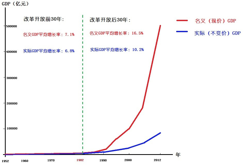 上圖紅色曲線是“名義GDP”。雖然“名義”上漲了100倍,但這30年物價漲了多少“磚家”並沒有告訴我們。而“學者”會通過查統計局的數據,算出前30年“名義GDP”的增長率是7.1%,而實際增長率是6.8%。也就是説平均每年有0.3%的通貨膨脹;而後30年“名義GDP”的增長率是16.5%,實際增長率是10.2%。也就是説平均每年通貨膨脹率是6.3%。把每年的“名義GDP”根據通貨膨脹換算為“實際GDP”後,就得到藍色曲線。上漲幅度比紅色曲線就要平緩得多。
