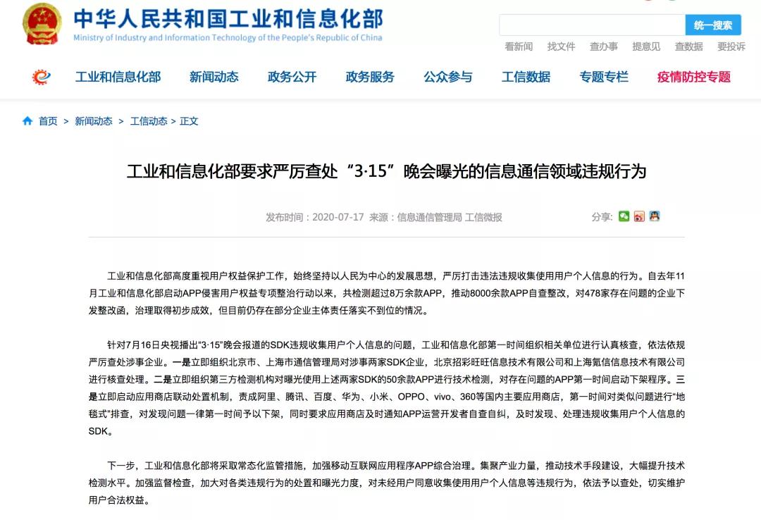 另外,工信部組織第三方檢測機構對央視曝光使用招彩旺旺、氪信SDK的50餘款APP進行檢測,對存在問題的APP第一時間啓動下架程序。